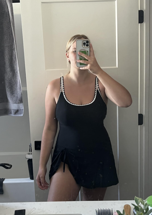 Wore this on a beach vacation and also at the hotel pool. It’s modest but still cute, and I didn’t have to keep adjusting it. I’d buy another color.